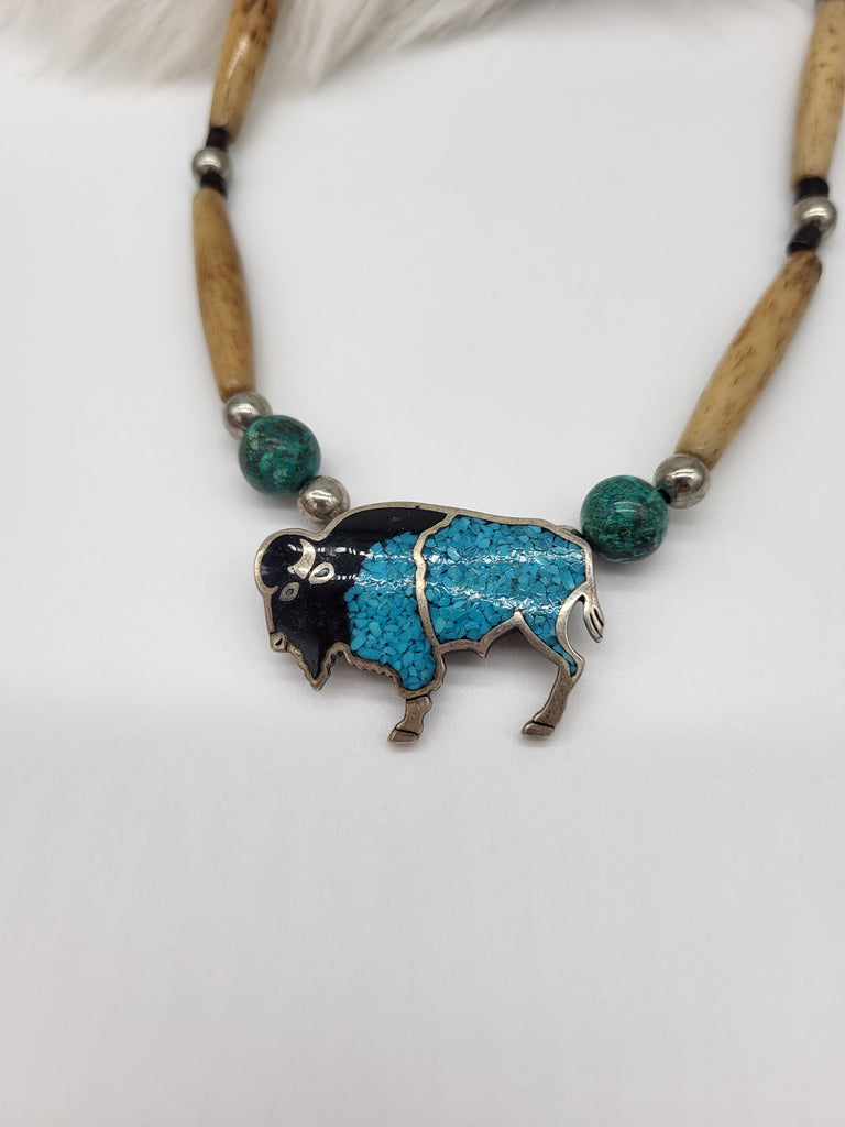 Sterling & Turquoise Buffalo Pendant & Beaded 18" Necklace - Marcia Nickol