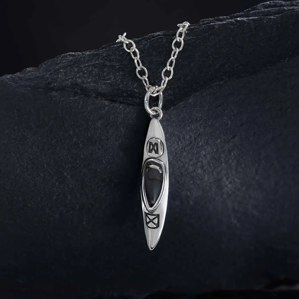 This sterling silver kayak necklace is the perfect pendant to let those around you know what you love. For those who share the love of kayaking there is nothing quite like paddling through still waters as the wind breezes by and the landscape spreads out before you. Comes on a simple sterling silver 18" cable chain with a spring ring clasp, adjustable to 16". The charm measures 25x5mm, excluding jump ring. · Made from Recycled Sterling Silver. · Lipped necklace cards will come free with every order. Please note that necklaces will not be pre-carded.