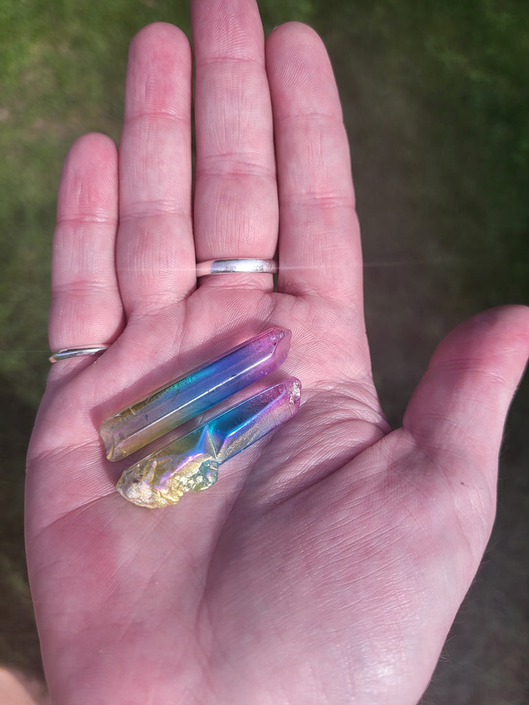 *Aura Quartz is a high vibration stone made from crystal quartz and a vapor coating of platinum. It works with the crown chakra to create a protective shield that helps provide inner peace, mental clarity, heightened intellect, and pure serenity. Use with heart stones like Amazonite, Rose Quartz, or Rhodonite to cleanse and heal your heart.